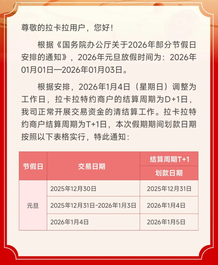 注:转自拉卡拉公众号,本公司节假日售后服务照旧,售前办理业务正常开展,如有疑问请致电:4000860036